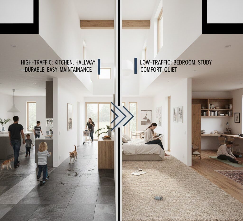 Before comparing materials, the first step is understanding how the room will be used. High-traffic areas such as entryways, kitchens, hallways, and commercial spaces in Chicago require floors that resist wear and moisture. Bedrooms and offices allow for softer, warmer materials that prioritize comfort.
